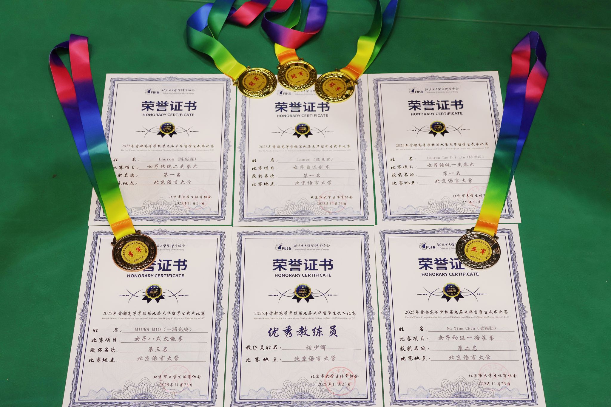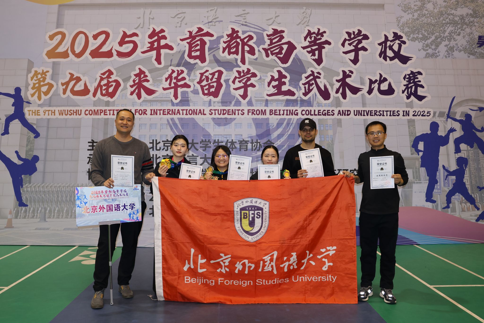 11月23日,2025年首都高等学校第九届来华留学生武术比赛成功举行。北外代表队由留学生办公室凯琳担任领队,体育教研部胡少辉担任教练。经过激烈的比拼和角逐,北外代表团在个人项目中最终斩获三枚金牌、一枚银牌、一枚铜牌,胡少辉荣获“优秀教练员”称号,创造了北外参加该项赛事以来的历史最佳战绩。